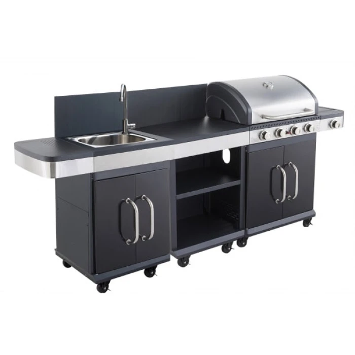 L’évier Fidgi de Cookin’ Garden est un meuble d’appoint adapté aux deux barbecues de la gamme Fidgi (Fidgi 3 et Fidgi 4). Il peut également s’associer à la desserte Fidgi. L’évier vous permettra de nettoyer vos aliments, de faire la vaisselle ou de vous laver les mains lors de vos repas au barbecue. Son étage inférieur peut vous servir d’espace de rangement pour tous vos ustensiles de cuisine.